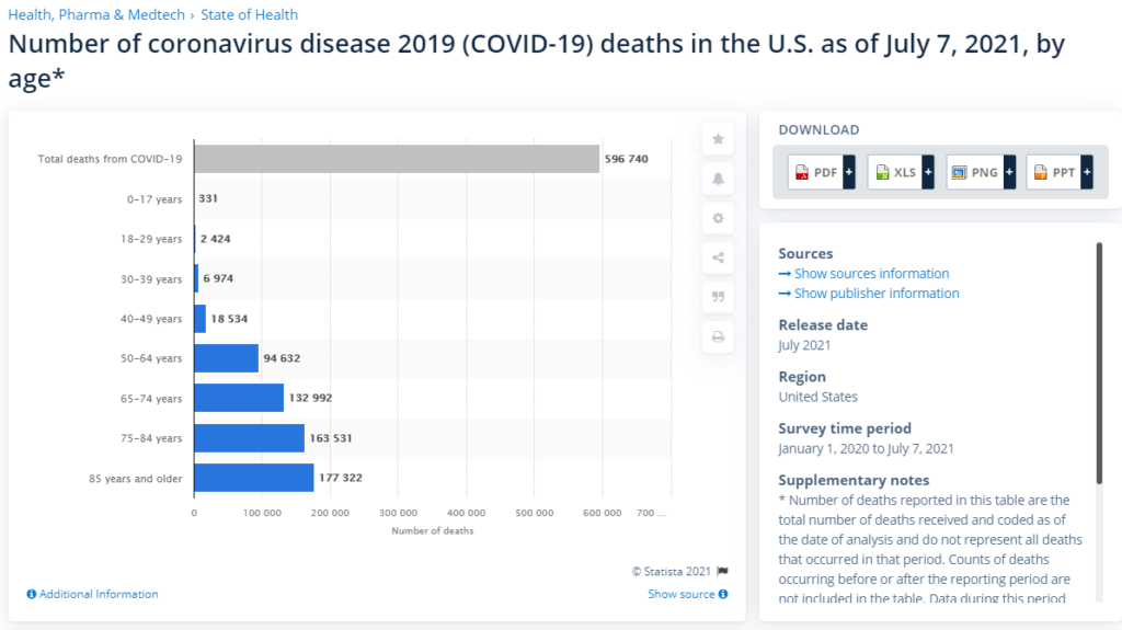 But what about the kids? Kids or people under 20 haven’t really been impacted by Covid. Deaths aren’t a perfect summary of this. But they do give you an idea of the impact. You can extrapolate the hospitalizations based on these figures.
