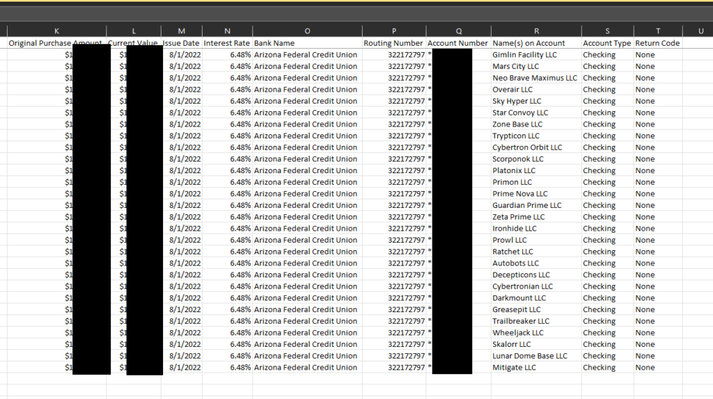 To do this, the program reads a CSV file containing all of your TreasuryDirect.gov account numbers and other relevant information, such as LLC names and purchase amounts. It then loops through each account, retrieves the necessary information from the TreasuryDirect.gov website using Selenium, and saves the data into a new column of the CSV file.