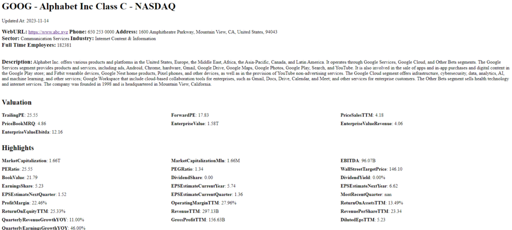 The code generates an in-depth profile of any stock specified. In this example, we take a look at Google. The output is a structured HTML file that includes a variety of information sections. First, it provides basic details such as the company’s name, ticker symbol, and the date of the most recent update. Next, it lists essential contact information, including the company’s web URL, phone number, and physical address. The sector and industry in which the company operates, as well as the number of full-time employees, are also displayed. The output then delves into valuation metrics like P/E ratios, enterprise value, and other financial ratios. Finally, it highlights key financial data points, such as market capitalization, EBITDA, and various earnings and revenue estimates. Overall, the code produces a multi-faceted profile that serves as a valuable resource for anyone looking to understand Alphabet Inc’s business and financial standing in great detail.