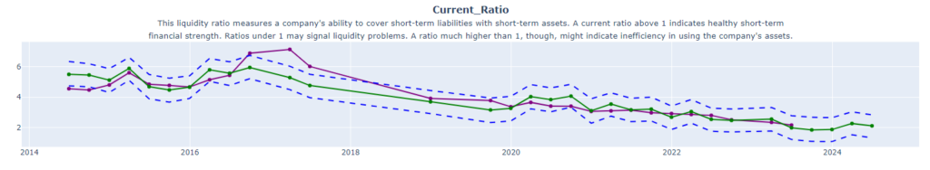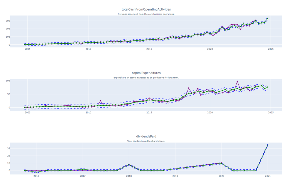 These plots dive into essential cash flow metrics, specifically Total Cash from Operating Activities, Capital Expenditures, and Dividends Paid. These key figures are also extended into the future using Facebook Prophet’s forecasting capabilities. The resulting predictions not only map out the anticipated cash flow movements for the next year but are also bracketed by upper and lower confidence intervals, presenting a comprehensive range of financial possibilities. These plots offer a well-rounded perspective on the company’s future liquidity and capital allocation strategies.