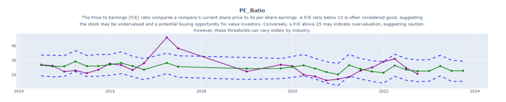 These plots present a comprehensive visualization of key earnings and profitability metrics extracted from the income statement, including Net Income, Operating Income, Total Revenue, Gross Profit, and Free Cash Flow. The financial numbers are then forward projected using Facebook Prophet. These predictions not only display the expected trends for the next year but also encompass upper and lower bounds, providing a range of possible outcomes. This integration of historical data with advanced forecasting techniques offers a nuanced understanding of the company’s financial trajectory.