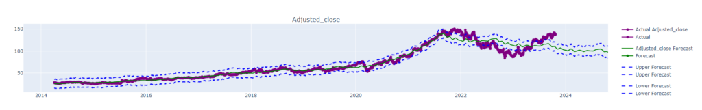 This plot visualizes the historical and predicted adjusted close prices for a particular asset, utilizing the Facebook Prophet algorithm for the forecast. The x-axis represents the timeline, extending from the earliest available historical data to one year into the future. The y-axis shows the adjusted close prices. Historical prices are plotted as solid purple lines. The predicted value is a solid green line with blue dotted lines as the high and low predictions. This predictive model leverages the power of Facebook Prophet to analyze seasonal and trend components in the historical data, providing a one-year outlook on potential price movements.
