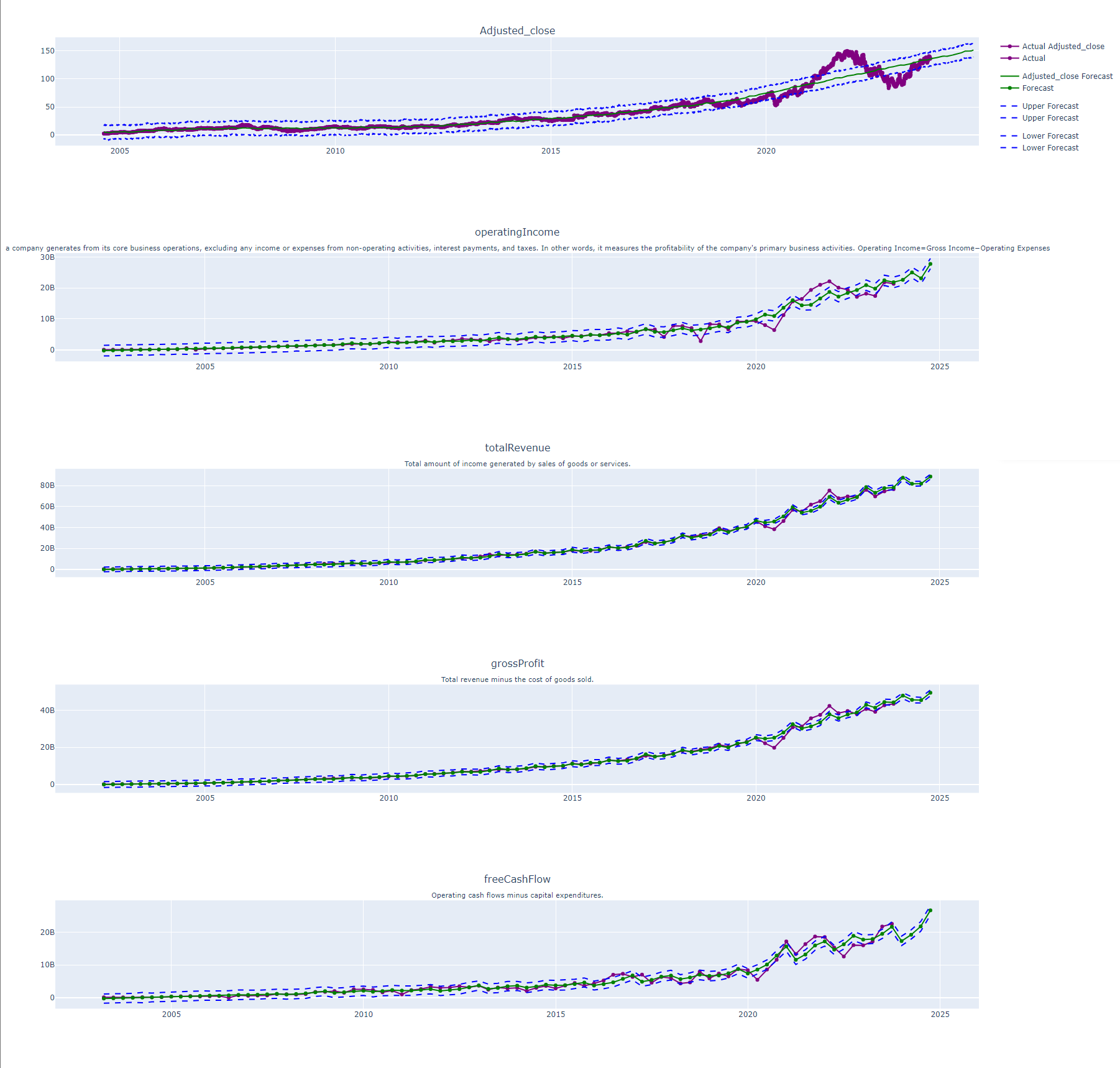 These plots present a comprehensive visualization of key earnings and profitability metrics extracted from the income statement, including Net Income, Operating Income, Total Revenue, Gross Profit, and Free Cash Flow. The financial numbers are then forward projected using Facebook Prophet. These predictions not only display the expected trends for the next year but also encompass upper and lower bounds, providing a range of possible outcomes. This integration of historical data with advanced forecasting techniques offers a nuanced understanding of the company’s financial trajectory.