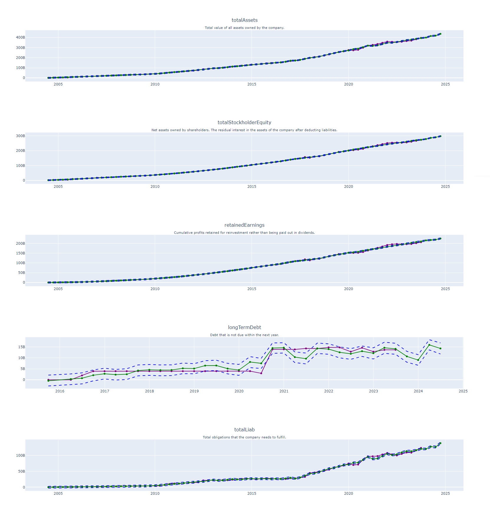 These plots offer an in-depth analysis of crucial balance sheet metrics such as Total Assets, Total Stockholder Equity, Retained Earnings, Long-Term Debt, and Total Liabilities. Leveraging the predictive power of Facebook Prophet, these key financial indicators are forecasted into the future. The projections not only illustrate the expected financial posture for the forthcoming year but also include upper and lower prediction intervals, giving a full spectrum of potential financial scenarios. By melding past balance sheet data with sophisticated predictive modeling, the plots provide a multi-dimensional view of the company’s expected financial stability and risk profile.