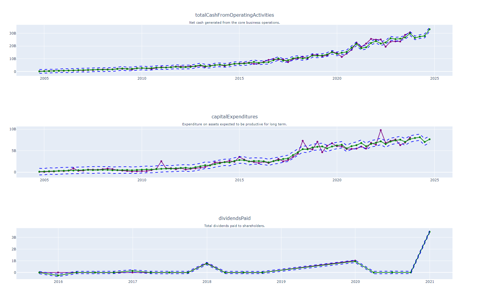 These plots dive into essential cash flow metrics, specifically Total Cash from Operating Activities, Capital Expenditures, and Dividends Paid. These key figures are also extended into the future using Facebook Prophet’s forecasting capabilities. The resulting predictions not only map out the anticipated cash flow movements for the next year but are also bracketed by upper and lower confidence intervals, presenting a comprehensive range of financial possibilities. These plots offer a well-rounded perspective on the company’s future liquidity and capital allocation strategies.