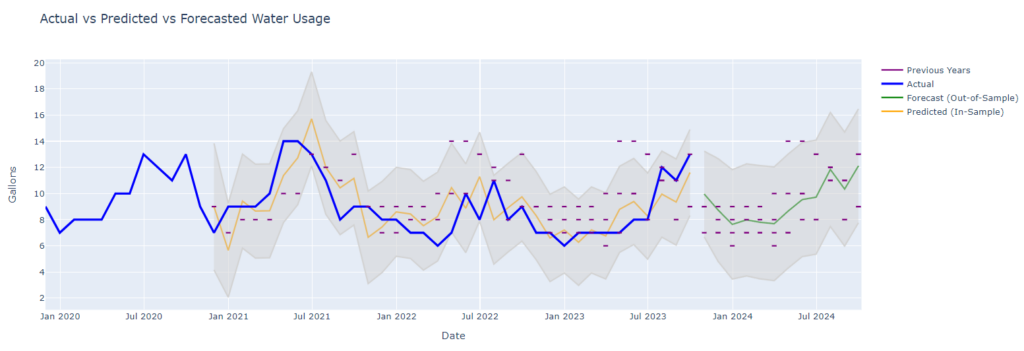 Using Plotly, a versatile graphing library, the program generates an interactive chart. It not only shows actual water usage but also plots predicted values and their confidence intervals.