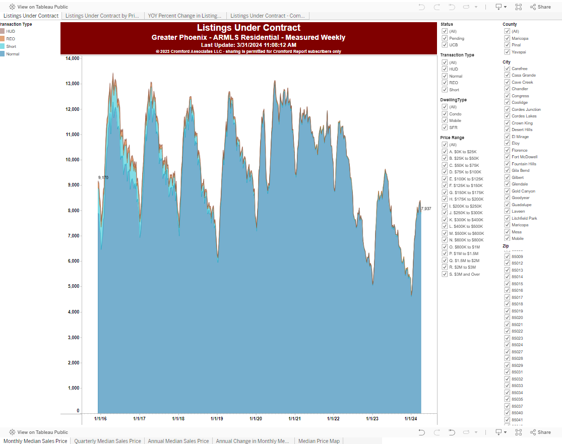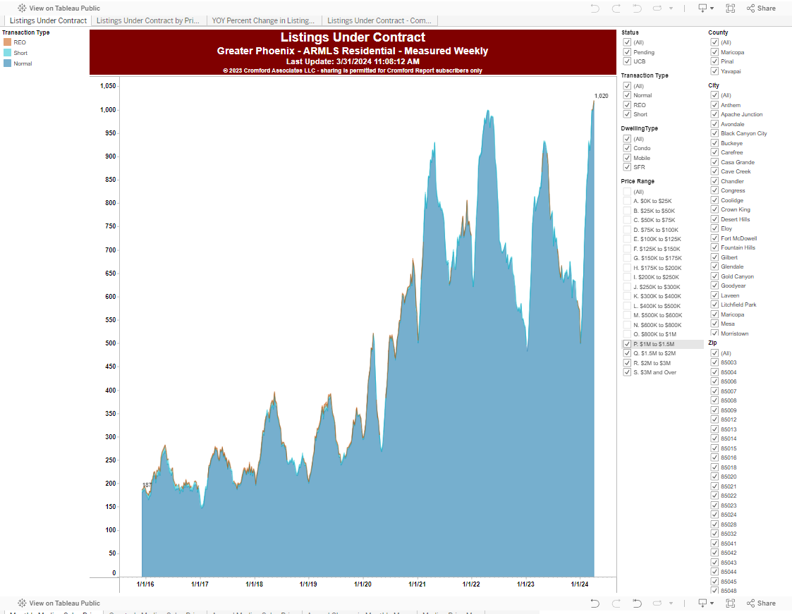 Today, I dove into housing data and decided to filter houses based on price to determine how it impacted sales numbers. The graph below illustrates Listings Under Contract up until March.