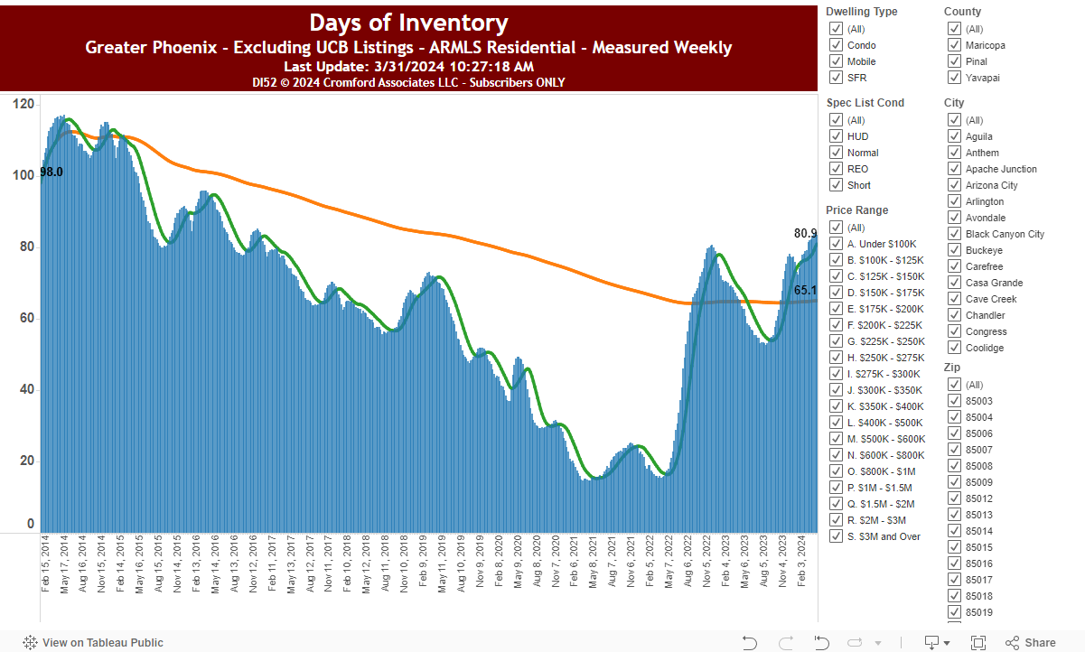 To gain a more comprehensive understanding of the market, let’s look at the days of inventory. For houses priced over $1M, the current days of inventory stand at 170 days, a notable increase from the low of 43 days. However, this figure is roughly equivalent to the levels observed in October 2020. While the trend is undoubtedly increasing, it’s crucial to consider the broader context.