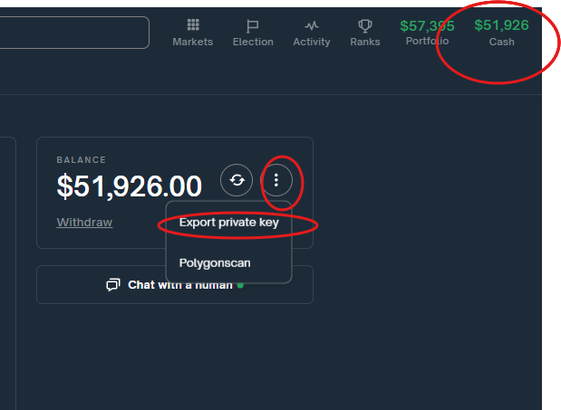 The first step is to create an environment file. You only want to populate the PK value. You do not know the other 3 variables yet so just comment them out. You can find this private key by logging in to your Polymarket.com account. Clicking on ‘Cash’, 3 dots, and finally Export Private Key.