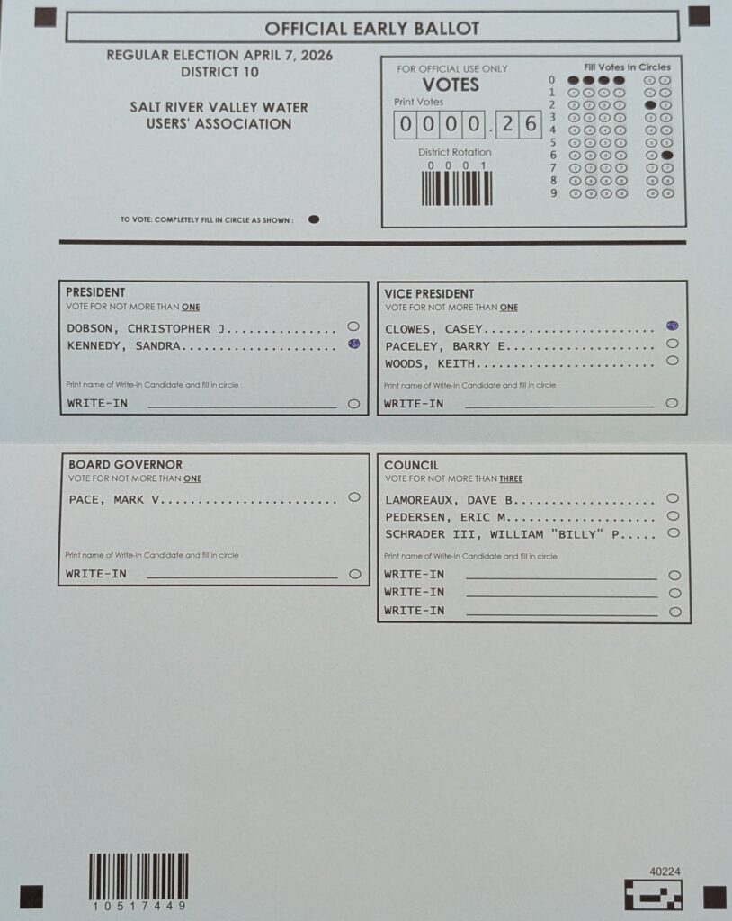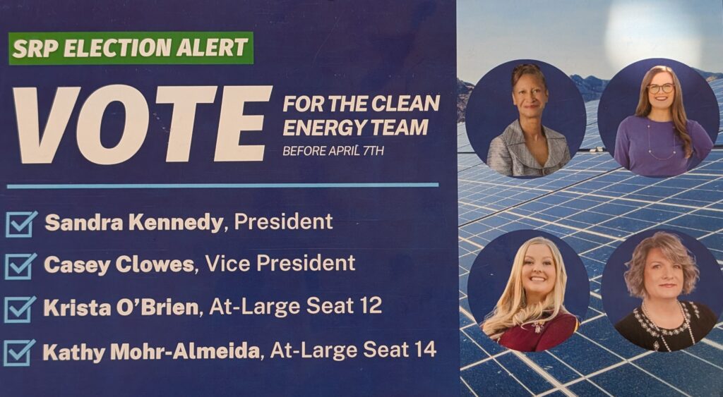 Which brings this back to SRP. SRP is different from APS in one very important respect: SRP is a political subdivision of Arizona, its prices are not regulated by the Arizona Corporation Commission, and SRP’s publicly elected Board of Directors has the authority to establish electric prices. Ballots for this election are mailed March 11, the final day to request one is March 27, and election day is April 7.