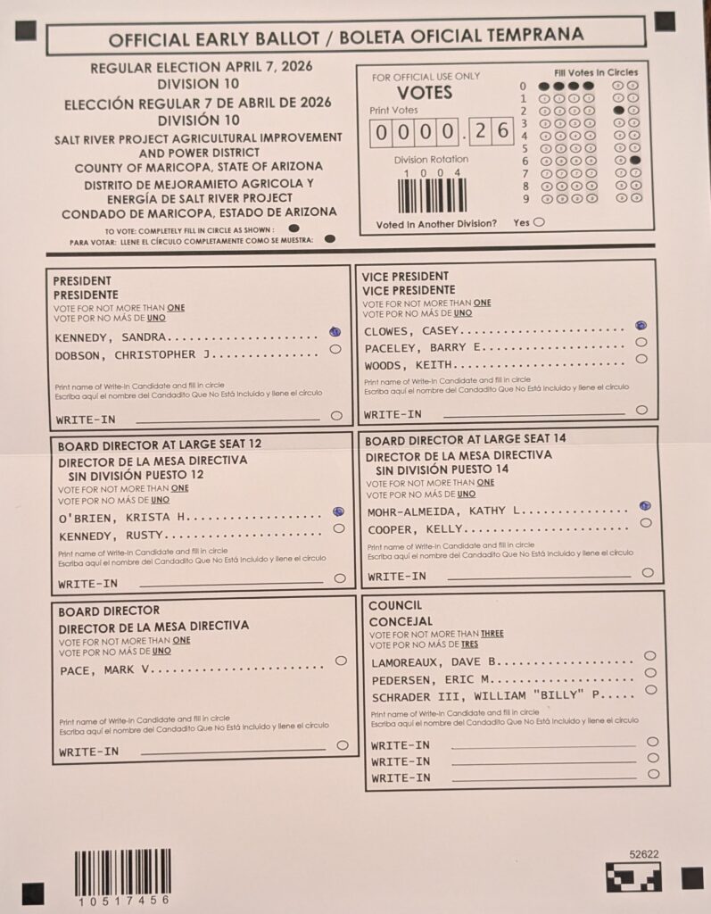 For me, the question comes down to direction. Do we keep reinforcing a system where everything stays centralized and the individual remains fully dependent? Or do we start moving toward something more balanced, where households have more flexibility, more transparency, and more ability to manage their own energy? For that reason, in the SRP-wide races, I am voting for the Clean Energy Team: Sandra Kennedy, Casey Clowes, Krista O’Brien, and Kathy Mohr-Almeida.